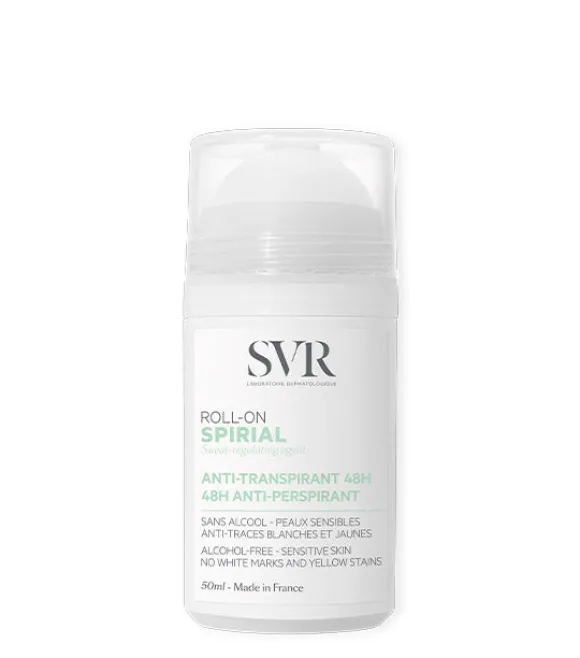 SVR, Spirial, desodorante, antitranspirante, sin fragancia, todo tipo de piel, piel sensible, transpiración normal, transpiración excesiva, regulador del sudor, absorción de humedad, combate malos olores, hipoalergénico, calmante,