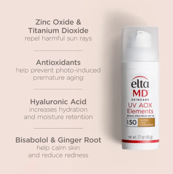 Elta MD UV AOX Elements Tinted, un protector solar totalmente mineral y rico en antioxidantes para proteger, corregir y mejorar la piel afectada por el envejecimiento prematuro fotoinducido.
